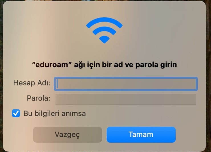 2. Açılan pencerede kurumunuza ait "kullanıcı.adi@kurumunuz.edu.tr" ve "şifre" bilgileri girilerek "Tamam" butonuna tıklanır. (İsterseniz "Bu bilgileri anımsa" kutucuğu da işaretlenebilir.)