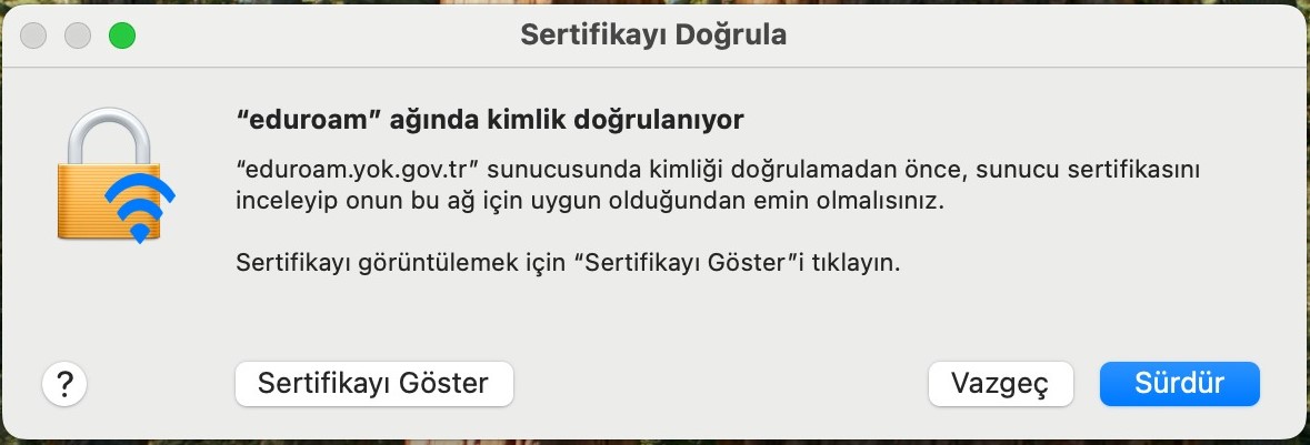 3. Daha sonra sertifikayla alakalı bir pencere geldiği takdirde "Sürdür" butonuna tıklanarak bağlantıya devam edilir ve "Eduroam" bağlantısı sağlanır.