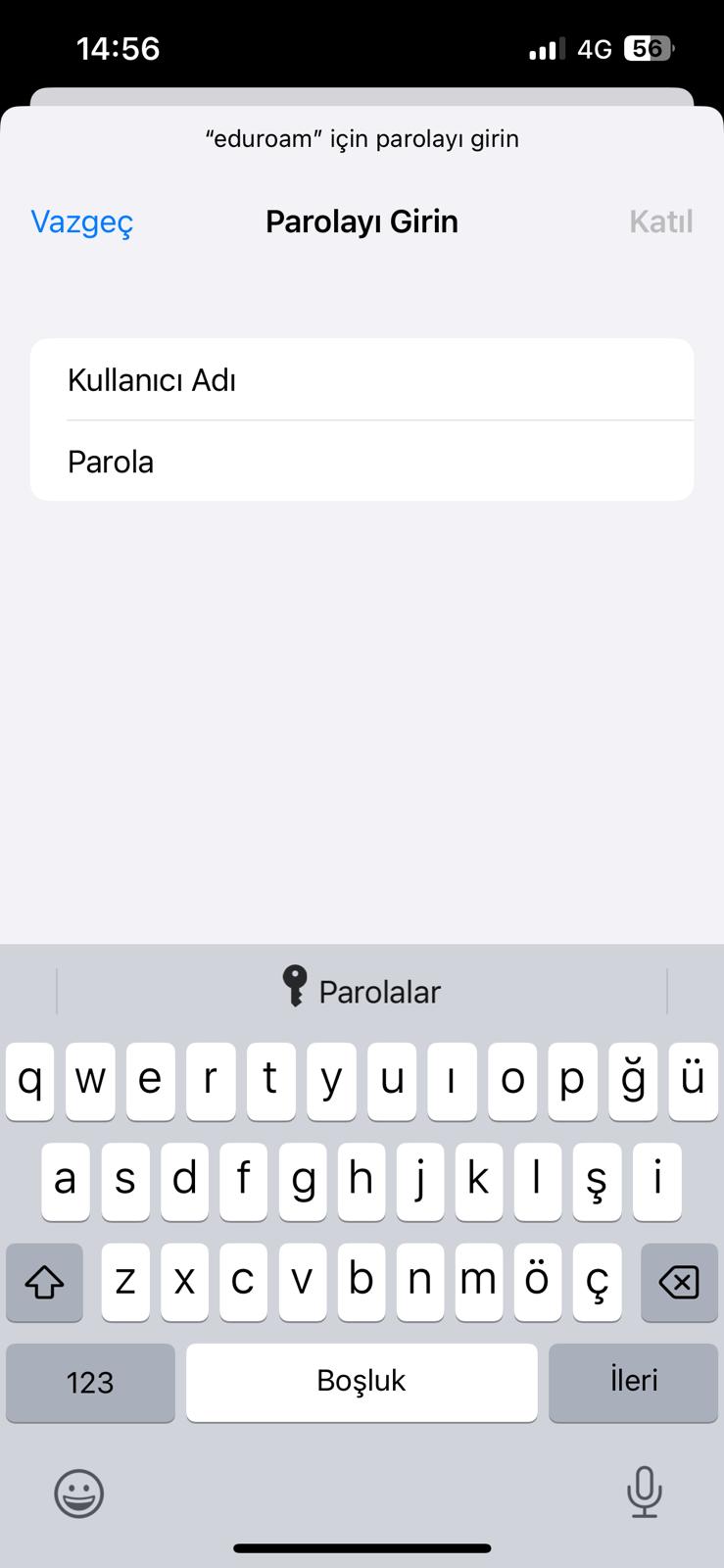 1. iPhone veya iOS işletim sistemi kullanan cihazlarda Wi-Fi listesinden "eduroam" yayını bulunarak tıklanır. Daha sonra size aşağıdaki gibi "kullanıcı.adınız@kurumunuz.edu.tr" ve "şifreniz" sorulacaktır. Gerekli bilgileri girdikten sonra sağ üst köşedeki "Katıl" butonuna tıklayınız.